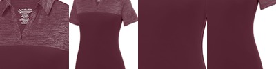 100% polyester heathered wicking knit top body, collar and sleeves ; 100% polyester wicking knit solid bottom body ; Wicks moisture away from the body ; Ladies' fit ; Pad print label ; Contrast self-fabric Johnny collar, placket, and yoke ; Contrast set-in sleeves ;