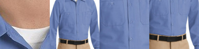 • Two button-thru, hex style pockets with angled bartacks, bartacked pencil stall on left pocket