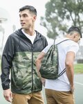 - Patented 2-in-1 windbreaker converts into functional drawcord backpack in seconds