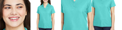 6 oz./yd2 / 210 gsm, 100% polyester pique; ChromaSoft™ technology combines the colorfastness of cationic dyes with soft cotton-feel performance; Moisture-wicking and antimicrobial performance; Feminine Y-neck placket with button detail; Self-fabric collar and integrated collar stays; Dyed-to-match buttons; Side vents; Tear away label;