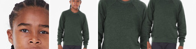 7 oz., 52% airlume combed and ring spun cotton, 48% polyester fleece, 32 singles; Sideseamed; Retail fit; Youth sizing; 1x1 ribbed cuff and waistband; Raglan sleeves; Tear away label; Pre-shrunk; BELLA+CANVAS uses sustainable manufacturing processes with Blue Sign certified dyes, efficient dye houses that adhere to the state of California’s EPA regulations around waste water treatment and usage, and cutting facilities in Los Angeles that run on partial solar power with comprehensive recycling programs for paper waste and fabric scraps.;