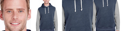 9.25 oz., 55% cotton 45% polyester heathered fleece; 1x1 yarndyed cuffs and waist; Lapover neckline with contrast lined hood; Set-on pouch pocket;