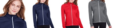 9 oz., 95% polyester, 5% elastane; Quick dry and breathable fabric; Modern fit, true to size; 1x1 spandex enhanced ribbed cuffs and waistband; Welt front pocket and inset sleeves; Coil zipper with metal pull;