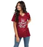 5.6 ounce 95% polyester/5% spandex wicking knit * Fully sublimated design * Wicks moisture * Odor resistant * Ladies' Fit * Tag-free label * V-neck collar * Garment protects against the sun with 50+ UPF * Set-in sleeves * Because of the manufacturing process of the fabric and garment, each tee will be unique